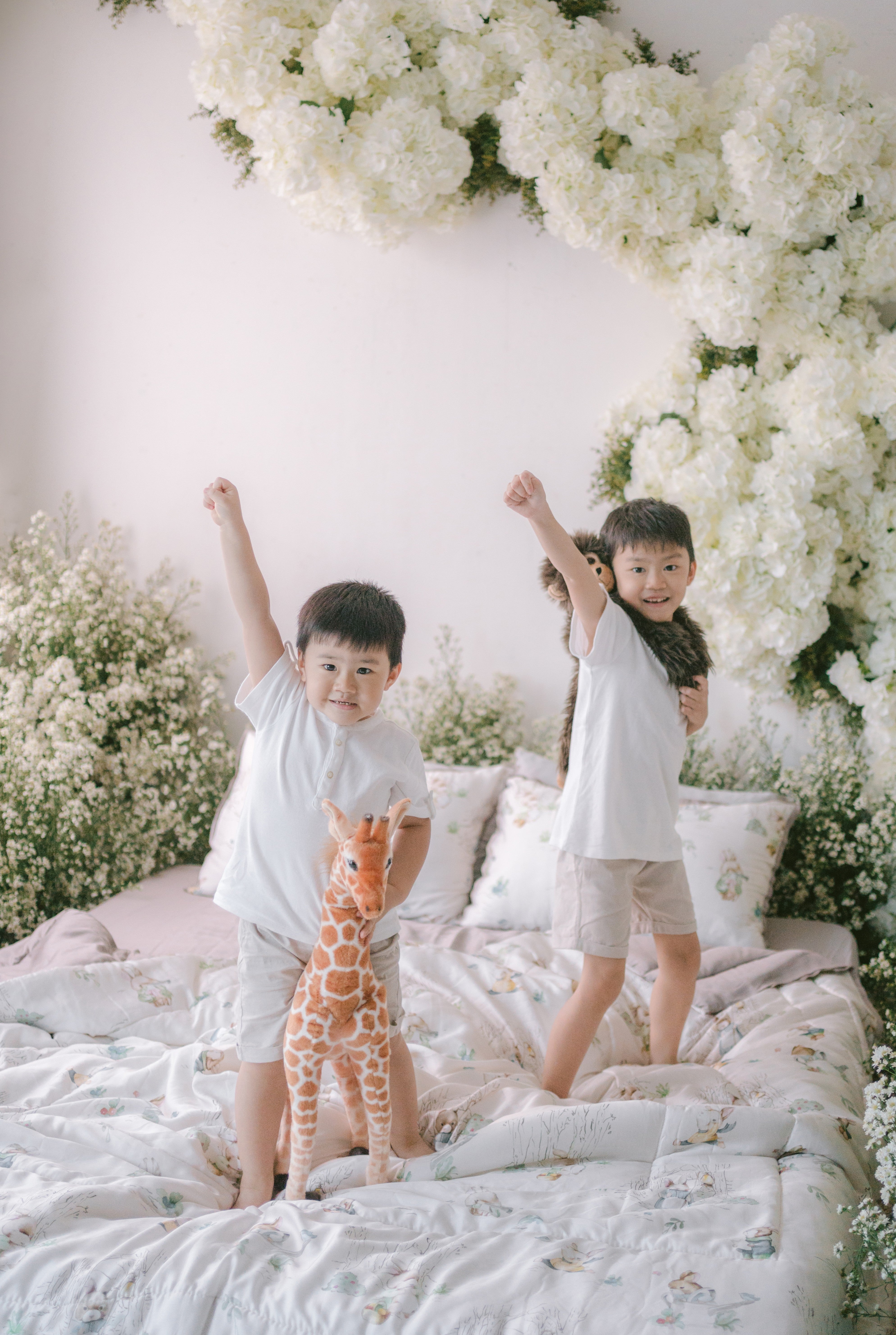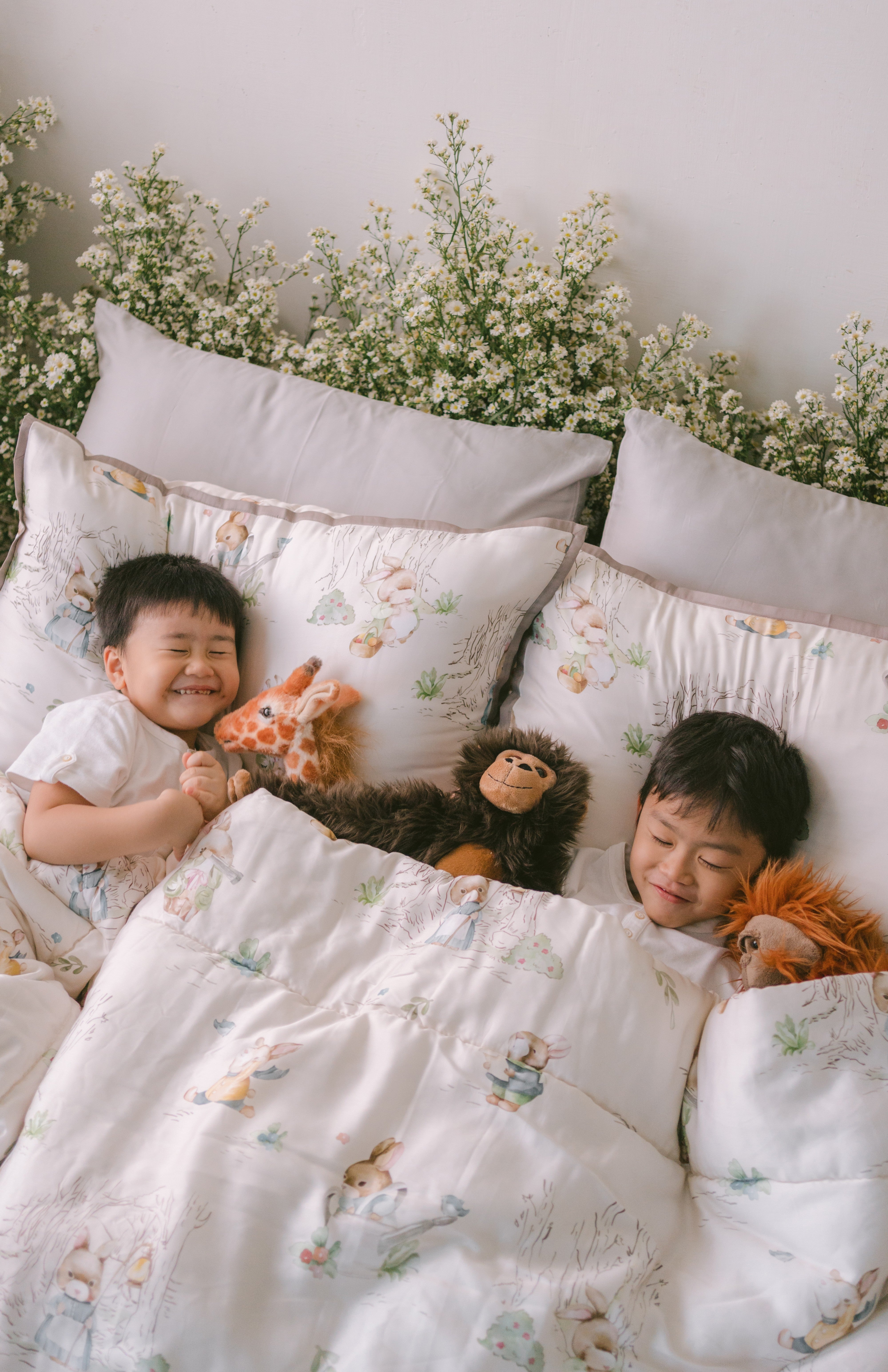 The kids' spring bed in the image looks cozy and cheerful, perfect for a playful and restful atmosphere. It features soft bedding with a cute illustrated pattern—possibly cartoon or fairy-tale characters—adding a whimsical touch. The comforter and pillow covers are light-colored with pastel accents, complementing the calming mint-green bedsheet and pillows. Surrounding the bed are lush white flowers and greenery, giving the setting a fresh, springtime vibe. The overall scene feels warm and homey, ideal for children to relax, read, or play together.