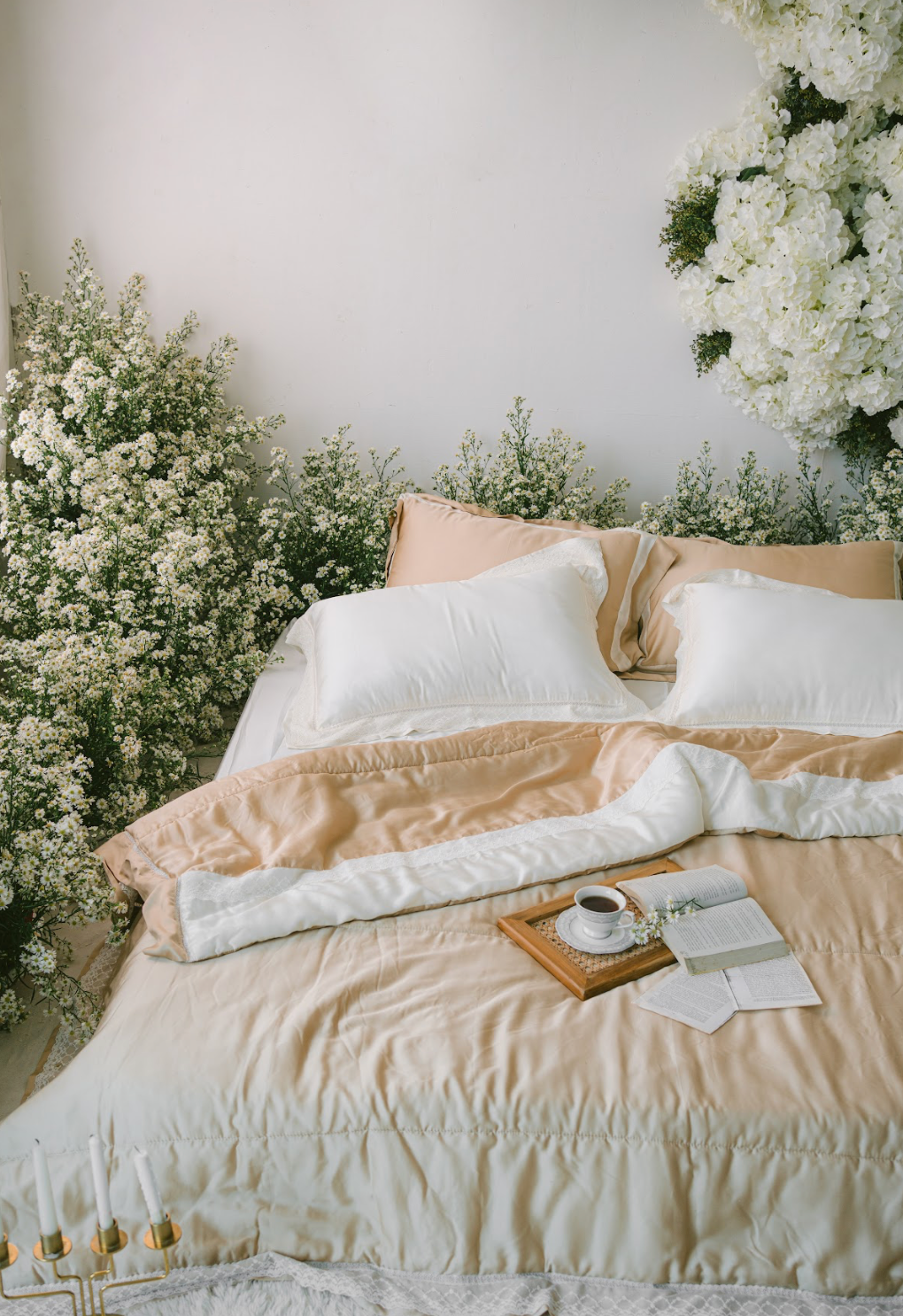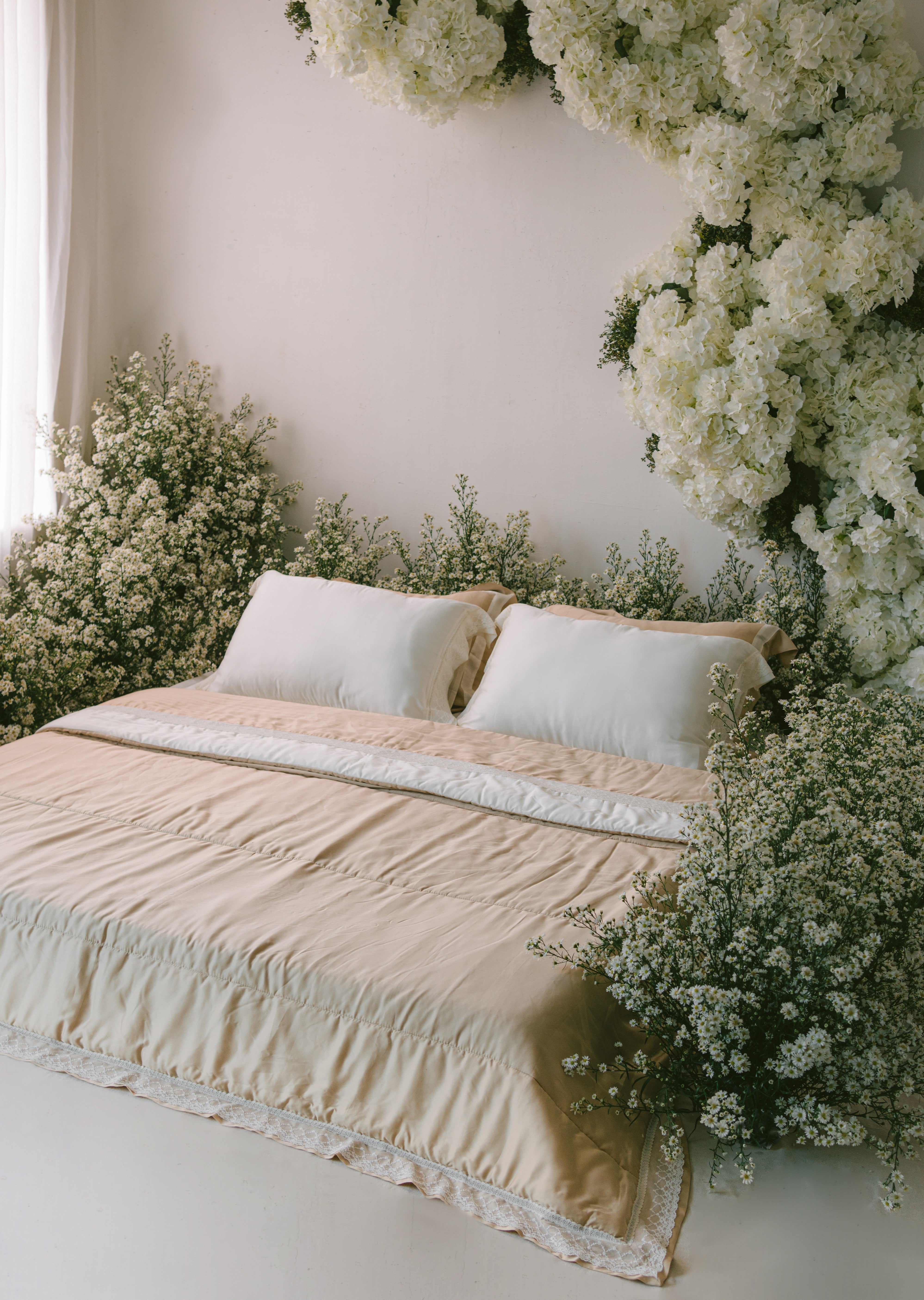 The warm champagne hue blends perfectly with soft white tones, creating a serene and timeless bedroom look. Finished with delicate lace and ruffle accents for a touch of sophistication.