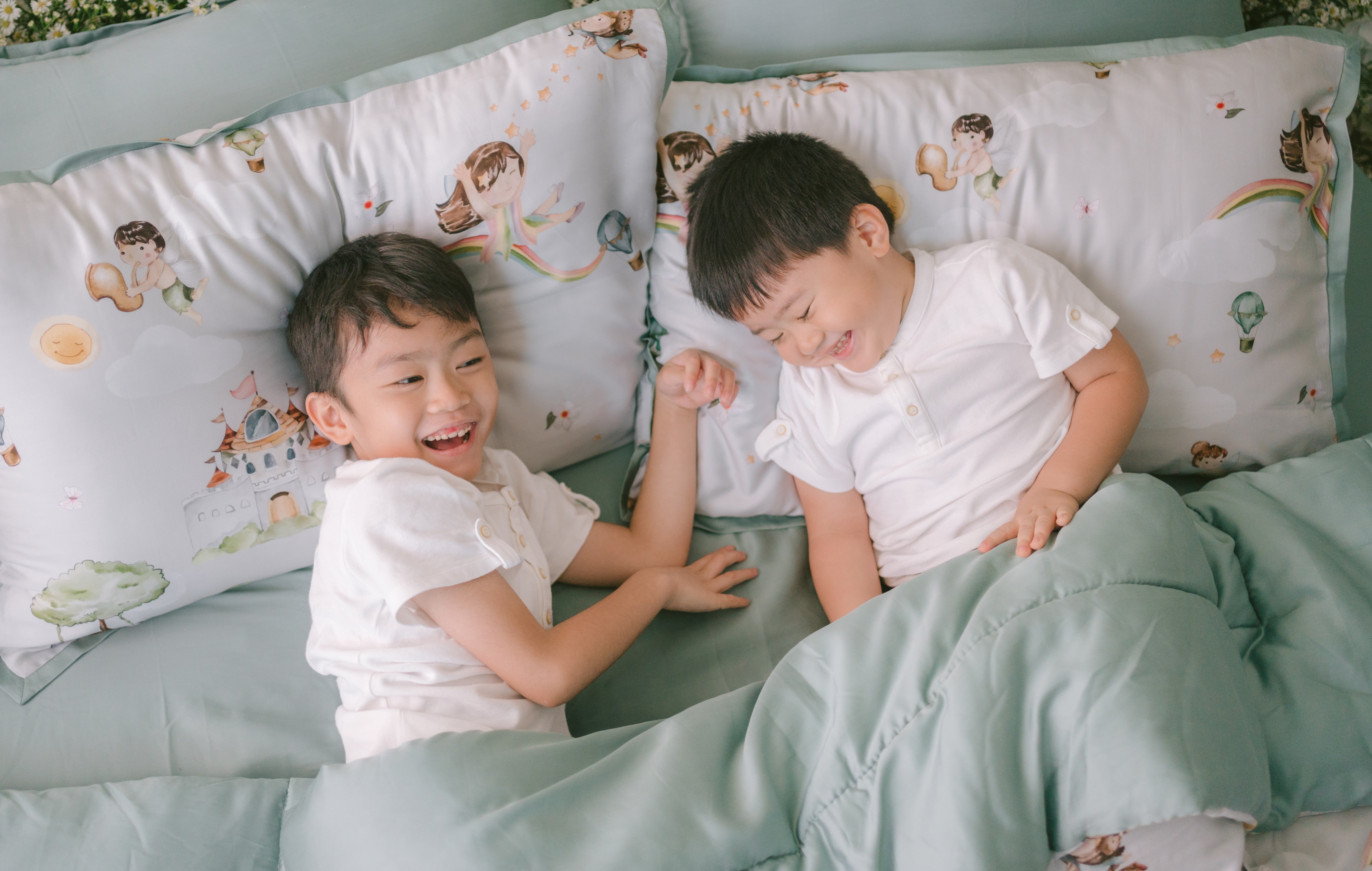 The kids' spring bed in the image looks cozy and cheerful, perfect for a playful and restful atmosphere. It features soft bedding with a cute illustrated pattern—possibly cartoon or fairy-tale characters—adding a whimsical touch. The comforter and pillow covers are light-colored with pastel accents, complementing the calming mint-green bedsheet and pillows. Surrounding the bed are lush white flowers and greenery, giving the setting a fresh, springtime vibe. The overall scene feels warm and homey, ideal for children to relax, read, or play together.